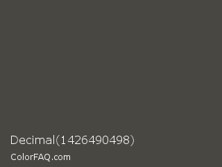 Decimal 1426490498 Color is a dark yellow color and the nearest color is Tundora #4a4244. Hex code #484742 and RGB value is rgb(72,71,66). In RGB color space, this color is composed of 28% red, 28% green, 26% blue, In CMYK color space, this color is composed of 0% cyan, 1% magenta, 8% yellow , 72% black , In HSL color space, this color has a hue angle of 50° , 4% saturation and 27% lightness.
