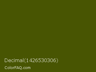 Decimal 1426530306 Color is a very dark yellow color and the nearest color is Verdun Green #495400. Hex code #485502 and RGB value is rgb(72,85,2). In RGB color space, this color is composed of 28% red, 33% green, 1% blue, In CMYK color space, this color is composed of 15% cyan, 0% magenta, 98% yellow , 67% black , In HSL color space, this color has a hue angle of 69° , 95% saturation and 17% lightness.