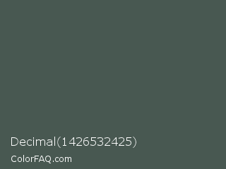 Decimal 1426532425 Color is a normal green color and the nearest color is Nandor #4b5d52. Hex code #485851 and RGB value is rgb(72,88,81). In RGB color space, this color is composed of 28% red, 35% green, 32% blue, In CMYK color space, this color is composed of 18% cyan, 0% magenta, 8% yellow , 65% black , In HSL color space, this color has a hue angle of 154° , 10% saturation and 31% lightness.