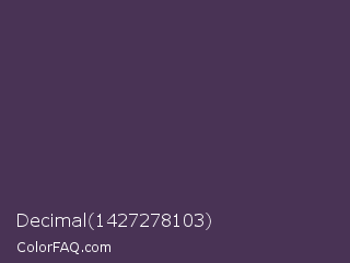 Decimal 1427278103 Color is a dark purple color and the nearest color is Voodoo #533455. Hex code #493355 and RGB value is rgb(73,51,85). In RGB color space, this color is composed of 29% red, 20% green, 33% blue, In CMYK color space, this color is composed of 14% cyan, 40% magenta, 0% yellow , 67% black , In HSL color space, this color has a hue angle of 279° , 25% saturation and 27% lightness.