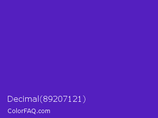 Decimal 89207121 Color is a normal indigo color and the nearest color is Purple Heart Crayola #652dc1. Hex code #541fbf and RGB value is rgb(84,31,191). In RGB color space, this color is composed of 33% red, 12% green, 75% blue, In CMYK color space, this color is composed of 56% cyan, 84% magenta, 0% yellow , 25% black , In HSL color space, this color has a hue angle of 260° , 72% saturation and 44% lightness.