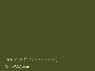 Decimal 1427333776 Color is a very dark yellow color and the nearest color is Army Green #4b5320. Hex code #495022 and RGB value is rgb(73,80,34). In RGB color space, this color is composed of 29% red, 31% green, 13% blue, In CMYK color space, this color is composed of 9% cyan, 0% magenta, 58% yellow , 69% black , In HSL color space, this color has a hue angle of 69° , 40% saturation and 22% lightness.