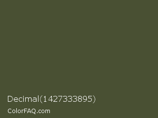 Decimal 1427333895 Color is a dark lime color and the nearest color is Rifle Green #444c38. Hex code #495033 and RGB value is rgb(73,80,51). In RGB color space, this color is composed of 29% red, 31% green, 20% blue, In CMYK color space, this color is composed of 9% cyan, 0% magenta, 36% yellow , 69% black , In HSL color space, this color has a hue angle of 74° , 22% saturation and 26% lightness.