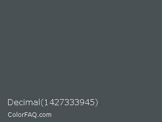 Decimal 1427333945 Color is a normal blue color and the nearest color is Abbey #4c4f56. Hex code #495053 and RGB value is rgb(73,80,83). In RGB color space, this color is composed of 29% red, 31% green, 33% blue, In CMYK color space, this color is composed of 12% cyan, 4% magenta, 0% yellow , 67% black , In HSL color space, this color has a hue angle of 198° , 6% saturation and 31% lightness.
