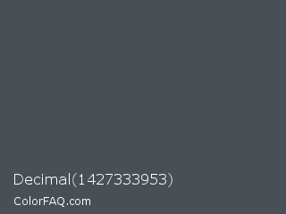 Decimal 1427333953 Color is a normal blue color and the nearest color is Abbey #4c4f56. Hex code #495055 and RGB value is rgb(73,80,85). In RGB color space, this color is composed of 29% red, 31% green, 33% blue, In CMYK color space, this color is composed of 14% cyan, 6% magenta, 0% yellow , 67% black , In HSL color space, this color has a hue angle of 205° , 8% saturation and 31% lightness.