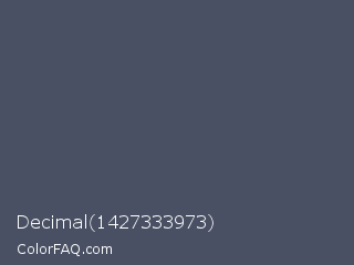 Decimal 1427333973 Color is a normal blue color and the nearest color is Trout #4a4e5a. Hex code #495063 and RGB value is rgb(73,80,99). In RGB color space, this color is composed of 29% red, 31% green, 39% blue, In CMYK color space, this color is composed of 26% cyan, 19% magenta, 0% yellow , 61% black , In HSL color space, this color has a hue angle of 224° , 15% saturation and 34% lightness.