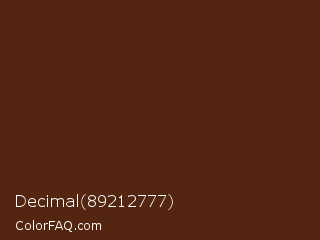 Decimal 89212777 Color is a very dark orange color and the nearest color is Cioccolato #55280c. Hex code #542611 and RGB value is rgb(84,38,17). In RGB color space, this color is composed of 33% red, 15% green, 7% blue, In CMYK color space, this color is composed of 0% cyan, 55% magenta, 80% yellow , 67% black , In HSL color space, this color has a hue angle of 19° , 66% saturation and 20% lightness.