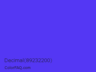 Decimal 89232200 Color is a normal indigo color and the nearest color is Han Purple #5218fa. Hex code #5437f4 and RGB value is rgb(84,55,244). In RGB color space, this color is composed of 33% red, 22% green, 96% blue, In CMYK color space, this color is composed of 66% cyan, 77% magenta, 0% yellow , 4% black , In HSL color space, this color has a hue angle of 249° , 90% saturation and 59% lightness.