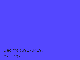 Decimal 89273429 Color is a light indigo color and the nearest color is Very Light Blue #6666ff. Hex code #5447ff and RGB value is rgb(84,71,255). In RGB color space, this color is composed of 33% red, 28% green, 100% blue, In CMYK color space, this color is composed of 67% cyan, 72% magenta, 0% yellow , 0% black , In HSL color space, this color has a hue angle of 244° , 100% saturation and 64% lightness.