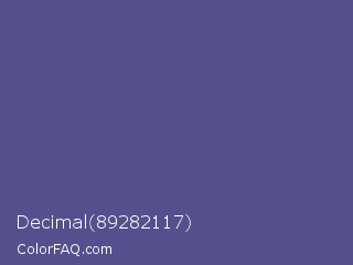 Decimal 89282117 Color is a normal indigo color and the nearest color is Victoria #534491. Hex code #54508d and RGB value is rgb(84,80,141). In RGB color space, this color is composed of 33% red, 31% green, 55% blue, In CMYK color space, this color is composed of 40% cyan, 43% magenta, 0% yellow , 45% black , In HSL color space, this color has a hue angle of 244° , 28% saturation and 43% lightness.