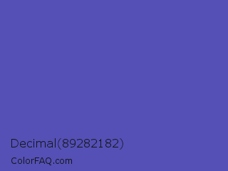 Decimal 89282182 Color is a normal indigo color and the nearest color is Plump Purple #5946b2. Hex code #5450b6 and RGB value is rgb(84,80,182). In RGB color space, this color is composed of 33% red, 31% green, 71% blue, In CMYK color space, this color is composed of 54% cyan, 56% magenta, 0% yellow , 29% black , In HSL color space, this color has a hue angle of 242° , 41% saturation and 51% lightness.