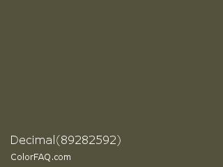 Decimal 89282592 Color is a dark yellow color and the nearest color is Kabul #5e483e. Hex code #54513c and RGB value is rgb(84,81,60). In RGB color space, this color is composed of 33% red, 32% green, 24% blue, In CMYK color space, this color is composed of 0% cyan, 4% magenta, 29% yellow , 67% black , In HSL color space, this color has a hue angle of 53° , 17% saturation and 28% lightness.