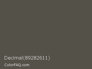 Decimal 89282611 Color is a normal orange color and the nearest color is Fuscous Gray #54534d. Hex code #545149 and RGB value is rgb(84,81,73). In RGB color space, this color is composed of 33% red, 32% green, 29% blue, In CMYK color space, this color is composed of 0% cyan, 4% magenta, 13% yellow , 67% black , In HSL color space, this color has a hue angle of 44° , 7% saturation and 31% lightness.