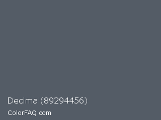 Decimal 89294456 Color is a normal blue color and the nearest color is Scarpa Flow #585562. Hex code #545c66 and RGB value is rgb(84,92,102). In RGB color space, this color is composed of 33% red, 36% green, 40% blue, In CMYK color space, this color is composed of 18% cyan, 10% magenta, 0% yellow , 60% black , In HSL color space, this color has a hue angle of 213° , 10% saturation and 36% lightness.