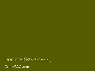 Decimal 89294899 Color is a very dark yellow color and the nearest color is Verdun Green #495400. Hex code #545d01 and RGB value is rgb(84,93,1). In RGB color space, this color is composed of 33% red, 36% green, 0% blue, In CMYK color space, this color is composed of 10% cyan, 0% magenta, 99% yellow , 64% black , In HSL color space, this color has a hue angle of 66° , 98% saturation and 18% lightness.