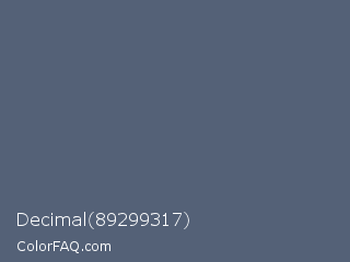 Decimal 89299317 Color is a normal blue color and the nearest color is Paynes Grey #536878. Hex code #546177 and RGB value is rgb(84,97,119). In RGB color space, this color is composed of 33% red, 38% green, 47% blue, In CMYK color space, this color is composed of 29% cyan, 18% magenta, 0% yellow , 53% black , In HSL color space, this color has a hue angle of 218° , 17% saturation and 40% lightness.