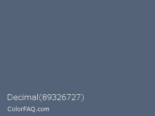 Decimal 89326727 Color is a normal blue color and the nearest color is Paynes Grey #536878. Hex code #546377 and RGB value is rgb(84,99,119). In RGB color space, this color is composed of 33% red, 39% green, 47% blue, In CMYK color space, this color is composed of 29% cyan, 17% magenta, 0% yellow , 53% black , In HSL color space, this color has a hue angle of 214° , 17% saturation and 40% lightness.