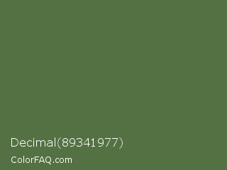 Decimal 89341977 Color is a normal green color and the nearest color is Chalet Green #516e3d. Hex code #547143 and RGB value is rgb(84,113,67). In RGB color space, this color is composed of 33% red, 44% green, 26% blue, In CMYK color space, this color is composed of 26% cyan, 0% magenta, 41% yellow , 56% black , In HSL color space, this color has a hue angle of 98° , 26% saturation and 35% lightness.