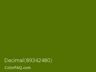 Decimal 89342480 Color is a dark lime color and the nearest color is Avocado #568203. Hex code #547202 and RGB value is rgb(84,114,2). In RGB color space, this color is composed of 33% red, 45% green, 1% blue, In CMYK color space, this color is composed of 26% cyan, 0% magenta, 98% yellow , 55% black , In HSL color space, this color has a hue angle of 76° , 97% saturation and 23% lightness.
