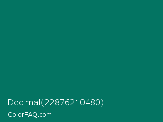 Decimal 22876210480 Color is a dark cyan color and the nearest color is Tropical Rain Forest #00755e. Hex code #037462 and RGB value is rgb(3,116,98). In RGB color space, this color is composed of 1% red, 45% green, 38% blue, In CMYK color space, this color is composed of 97% cyan, 0% magenta, 16% yellow , 55% black , In HSL color space, this color has a hue angle of 170° , 95% saturation and 23% lightness.