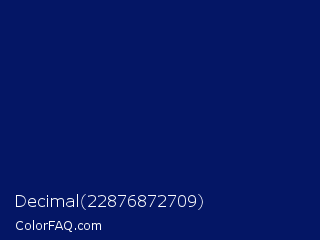 Decimal 22876872709 Color is a very dark blue color and the nearest color is Royal Blue #002366. Hex code #041665 and RGB value is rgb(4,22,101). In RGB color space, this color is composed of 2% red, 9% green, 40% blue, In CMYK color space, this color is composed of 96% cyan, 78% magenta, 0% yellow , 60% black , In HSL color space, this color has a hue angle of 229° , 92% saturation and 21% lightness.