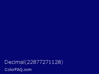 Decimal 22877271128 Color is a dark blue color and the nearest color is Arapawa #110c6c. Hex code #050672 and RGB value is rgb(5,6,114). In RGB color space, this color is composed of 2% red, 2% green, 45% blue, In CMYK color space, this color is composed of 96% cyan, 95% magenta, 0% yellow , 55% black , In HSL color space, this color has a hue angle of 239° , 92% saturation and 23% lightness.