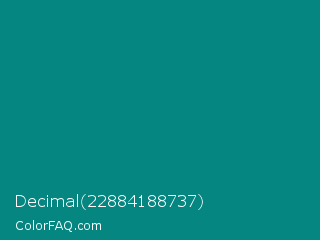 Decimal 22884188737 Color is a dark cyan color and the nearest color is Teal Green #00827f. Hex code #058681 and RGB value is rgb(5,134,129). In RGB color space, this color is composed of 2% red, 53% green, 51% blue, In CMYK color space, this color is composed of 96% cyan, 0% magenta, 4% yellow , 47% black , In HSL color space, this color has a hue angle of 178° , 93% saturation and 27% lightness.