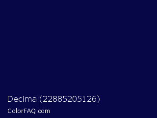 Decimal 22885205126 Color is a very dark indigo color and the nearest color is Stratos #000741. Hex code #070646 and RGB value is rgb(7,6,70). In RGB color space, this color is composed of 3% red, 2% green, 27% blue, In CMYK color space, this color is composed of 90% cyan, 91% magenta, 0% yellow , 73% black , In HSL color space, this color has a hue angle of 241° , 84% saturation and 15% lightness.