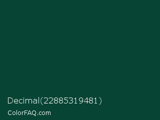 Decimal 22885319481 Color is a very dark green color and the nearest color is Sherwood Green #02402c. Hex code #074433 and RGB value is rgb(7,68,51). In RGB color space, this color is composed of 3% red, 27% green, 20% blue, In CMYK color space, this color is composed of 90% cyan, 0% magenta, 25% yellow , 73% black , In HSL color space, this color has a hue angle of 163° , 81% saturation and 15% lightness.