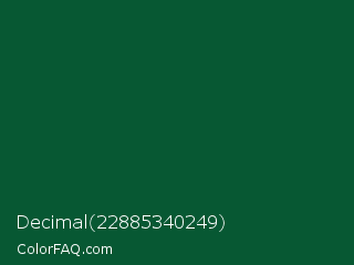 Decimal 22885340249 Color is a very dark green color and the nearest color is Sacramento State Green #00563f. Hex code #075833 and RGB value is rgb(7,88,51). In RGB color space, this color is composed of 3% red, 35% green, 20% blue, In CMYK color space, this color is composed of 92% cyan, 0% magenta, 42% yellow , 65% black , In HSL color space, this color has a hue angle of 153° , 85% saturation and 19% lightness.