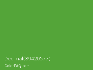 Decimal 89420577 Color is a normal green color and the nearest color is Apple #4fa83d. Hex code #54a539 and RGB value is rgb(84,165,57). In RGB color space, this color is composed of 33% red, 65% green, 22% blue, In CMYK color space, this color is composed of 49% cyan, 0% magenta, 65% yellow , 35% black , In HSL color space, this color has a hue angle of 105° , 49% saturation and 44% lightness.