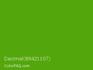 Decimal 89421107 Color is a normal green color and the nearest color is Christi #67a712. Hex code #54a60d and RGB value is rgb(84,166,13). In RGB color space, this color is composed of 33% red, 65% green, 5% blue, In CMYK color space, this color is composed of 49% cyan, 0% magenta, 92% yellow , 35% black , In HSL color space, this color has a hue angle of 92° , 85% saturation and 35% lightness.