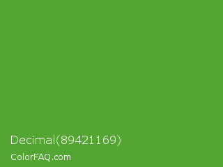 Decimal 89421169 Color is a normal green color and the nearest color is Apple #4fa83d. Hex code #54a633 and RGB value is rgb(84,166,51). In RGB color space, this color is composed of 33% red, 65% green, 20% blue, In CMYK color space, this color is composed of 49% cyan, 0% magenta, 69% yellow , 35% black , In HSL color space, this color has a hue angle of 103° , 53% saturation and 43% lightness.