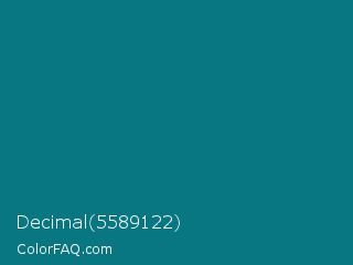 Decimal 5589122 Color is a dark cyan color and the nearest color is Blue Lagoon #017987. Hex code #087782 and RGB value is rgb(8,119,130). In RGB color space, this color is composed of 3% red, 47% green, 51% blue, In CMYK color space, this color is composed of 94% cyan, 8% magenta, 0% yellow , 49% black , In HSL color space, this color has a hue angle of 185° , 88% saturation and 27% lightness.