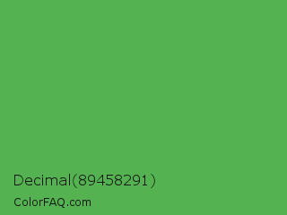Decimal 89458291 Color is a normal green color and the nearest color is Apple #4fa83d. Hex code #54b251 and RGB value is rgb(84,178,81). In RGB color space, this color is composed of 33% red, 70% green, 32% blue, In CMYK color space, this color is composed of 53% cyan, 0% magenta, 54% yellow , 30% black , In HSL color space, this color has a hue angle of 118° , 39% saturation and 51% lightness.