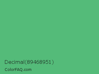 Decimal 89468951 Color is a normal green color and the nearest color is Emerald #50c878. Hex code #54bb79 and RGB value is rgb(84,187,121). In RGB color space, this color is composed of 33% red, 73% green, 47% blue, In CMYK color space, this color is composed of 55% cyan, 0% magenta, 35% yellow , 27% black , In HSL color space, this color has a hue angle of 142° , 43% saturation and 53% lightness.