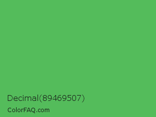 Decimal 89469507 Color is a normal green color and the nearest color is Fern #63b76c. Hex code #54bc5b and RGB value is rgb(84,188,91). In RGB color space, this color is composed of 33% red, 74% green, 36% blue, In CMYK color space, this color is composed of 55% cyan, 0% magenta, 52% yellow , 26% black , In HSL color space, this color has a hue angle of 124° , 44% saturation and 53% lightness.