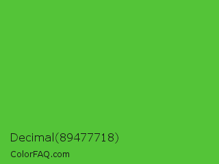 Decimal 89477718 Color is a normal green color and the nearest color is Green RYB #66b032. Hex code #54c438 and RGB value is rgb(84,196,56). In RGB color space, this color is composed of 33% red, 77% green, 22% blue, In CMYK color space, this color is composed of 57% cyan, 0% magenta, 71% yellow , 23% black , In HSL color space, this color has a hue angle of 108° , 56% saturation and 49% lightness.