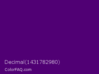 Decimal 1431782980 Color is a dark purple color and the nearest color is Pigment Indigo #4b0082. Hex code #500074 and RGB value is rgb(80,0,116). In RGB color space, this color is composed of 31% red, 0% green, 45% blue, In CMYK color space, this color is composed of 31% cyan, 100% magenta, 0% yellow , 55% black , In HSL color space, this color has a hue angle of 281° , 100% saturation and 23% lightness.