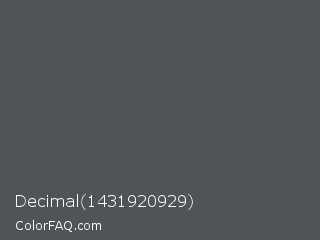 Decimal 1431920929 Color is a normal blue color and the nearest color is Davys Grey #555555. Hex code #505459 and RGB value is rgb(80,84,89). In RGB color space, this color is composed of 31% red, 33% green, 35% blue, In CMYK color space, this color is composed of 10% cyan, 6% magenta, 0% yellow , 65% black , In HSL color space, this color has a hue angle of 213° , 5% saturation and 33% lightness.