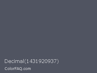 Decimal 1431920937 Color is a normal blue color and the nearest color is Scarpa Flow #585562. Hex code #505461 and RGB value is rgb(80,84,97). In RGB color space, this color is composed of 31% red, 33% green, 38% blue, In CMYK color space, this color is composed of 18% cyan, 13% magenta, 0% yellow , 62% black , In HSL color space, this color has a hue angle of 226° , 10% saturation and 35% lightness.
