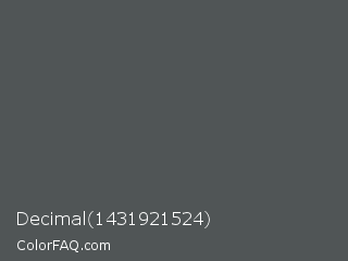 Decimal 1431921524 Color is a normal cyan color and the nearest color is Davys Grey #555555. Hex code #505556 and RGB value is rgb(80,85,86). In RGB color space, this color is composed of 31% red, 33% green, 34% blue, In CMYK color space, this color is composed of 7% cyan, 1% magenta, 0% yellow , 66% black , In HSL color space, this color has a hue angle of 190° , 4% saturation and 33% lightness.