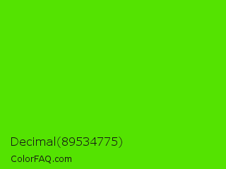 Decimal 89534775 Color is a normal green color and the nearest color is Chlorophyll Green #4aff00. Hex code #54e301 and RGB value is rgb(84,227,1). In RGB color space, this color is composed of 33% red, 89% green, 0% blue, In CMYK color space, this color is composed of 63% cyan, 0% magenta, 100% yellow , 11% black , In HSL color space, this color has a hue angle of 98° , 99% saturation and 45% lightness.