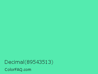 Decimal 89543513 Color is a light green color and the nearest color is Medium Aquamarine #66ddaa. Hex code #54ebaf and RGB value is rgb(84,235,175). In RGB color space, this color is composed of 33% red, 92% green, 69% blue, In CMYK color space, this color is composed of 64% cyan, 0% magenta, 26% yellow , 8% black , In HSL color space, this color has a hue angle of 156° , 79% saturation and 63% lightness.