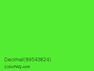 Decimal 89543824 Color is a normal green color and the nearest color is Harlequin Green #46cb18. Hex code #54ec32 and RGB value is rgb(84,236,50). In RGB color space, this color is composed of 33% red, 93% green, 20% blue, In CMYK color space, this color is composed of 64% cyan, 0% magenta, 79% yellow , 7% black , In HSL color space, this color has a hue angle of 109° , 83% saturation and 56% lightness.