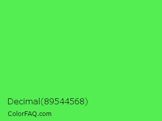 Decimal 89544568 Color is a light green color and the nearest color is Screamin Green #66ff66. Hex code #54ed52 and RGB value is rgb(84,237,82). In RGB color space, this color is composed of 33% red, 93% green, 32% blue, In CMYK color space, this color is composed of 65% cyan, 0% magenta, 65% yellow , 7% black , In HSL color space, this color has a hue angle of 119° , 81% saturation and 63% lightness.
