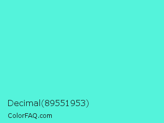 Decimal 89551953 Color is a light cyan color and the nearest color is Turquoise #40e0d0. Hex code #54f3db and RGB value is rgb(84,243,219). In RGB color space, this color is composed of 33% red, 95% green, 86% blue, In CMYK color space, this color is composed of 65% cyan, 0% magenta, 10% yellow , 5% black , In HSL color space, this color has a hue angle of 171° , 87% saturation and 64% lightness.