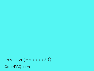 Decimal 89555523 Color is a light cyan color and the nearest color is Turquoise Blue #6cdae7. Hex code #54f6f3 and RGB value is rgb(84,246,243). In RGB color space, this color is composed of 33% red, 96% green, 95% blue, In CMYK color space, this color is composed of 66% cyan, 0% magenta, 1% yellow , 4% black , In HSL color space, this color has a hue angle of 179° , 90% saturation and 65% lightness.