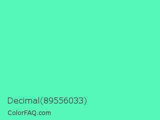 Decimal 89556033 Color is a light green color and the nearest color is Medium Aquamarine #66ddaa. Hex code #54f7b9 and RGB value is rgb(84,247,185). In RGB color space, this color is composed of 33% red, 97% green, 73% blue, In CMYK color space, this color is composed of 66% cyan, 0% magenta, 25% yellow , 3% black , In HSL color space, this color has a hue angle of 157° , 91% saturation and 65% lightness.