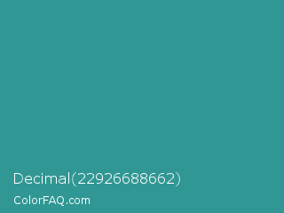 Decimal 22926688662 Color is a normal cyan color and the nearest color is Zomp #39a78e. Hex code #319794 and RGB value is rgb(49,151,148). In RGB color space, this color is composed of 19% red, 59% green, 58% blue, In CMYK color space, this color is composed of 68% cyan, 0% magenta, 2% yellow , 41% black , In HSL color space, this color has a hue angle of 178° , 51% saturation and 39% lightness.